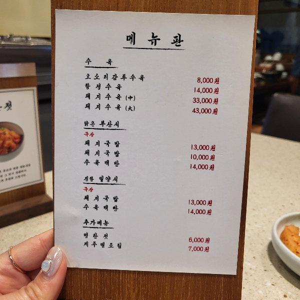 메뉴판이 귀엽게 테이블에 놓여져있었어요. 맑은 국물의 부산식 국밥과 진한 국물의 밀양식 국밥으로 나누어져있습니다. 그 외에 추가메뉴로 각종 젓갈이 있었고, 수육도 있었어요. 저희는 수육이 먹고 싶어서 방문했었거든요!